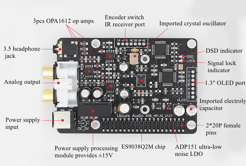 TZT Ustars Audio R38h DAC Board Decoder With OLED Remote Control Kit IIS 768KHz DSD512 For Raspberry Pi